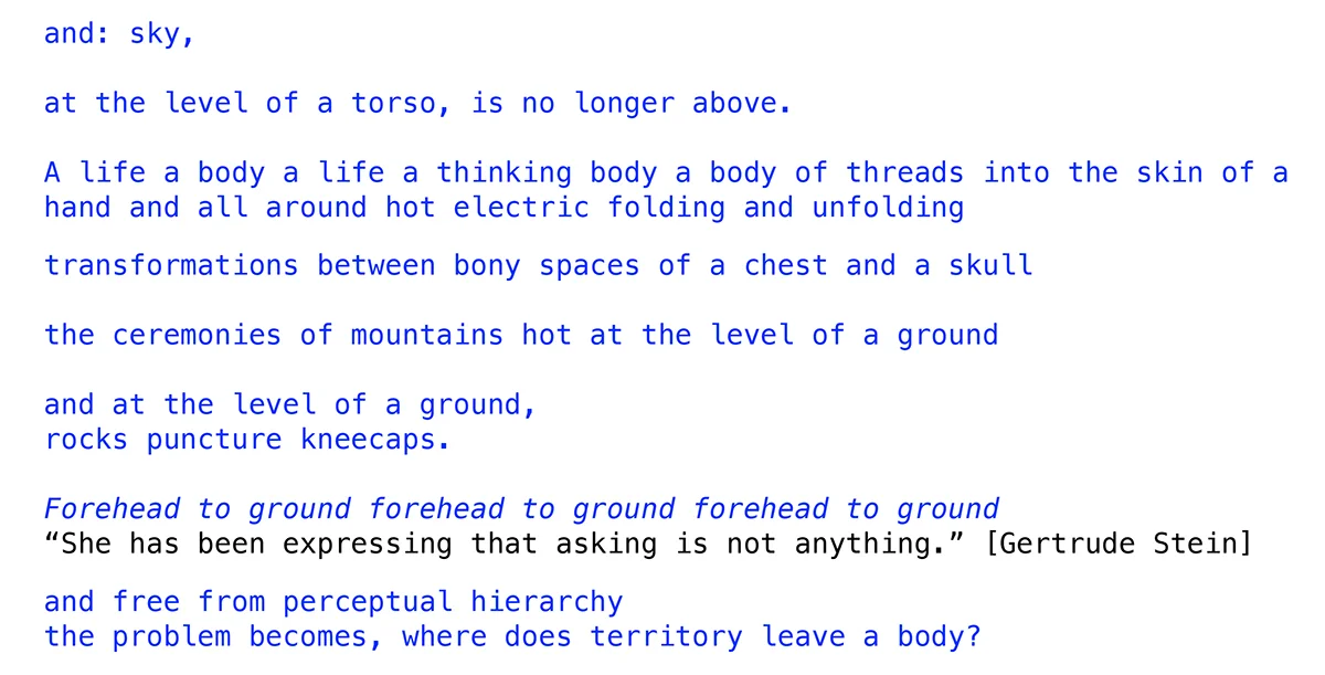 Movement and affect For Chibok girls Ways of seeing Simultaneous readings Becoming gesture Growth and destruction Space as feeling, place as idea Self aware Will you? Conflation Spacial concepts, a living lyric essay
